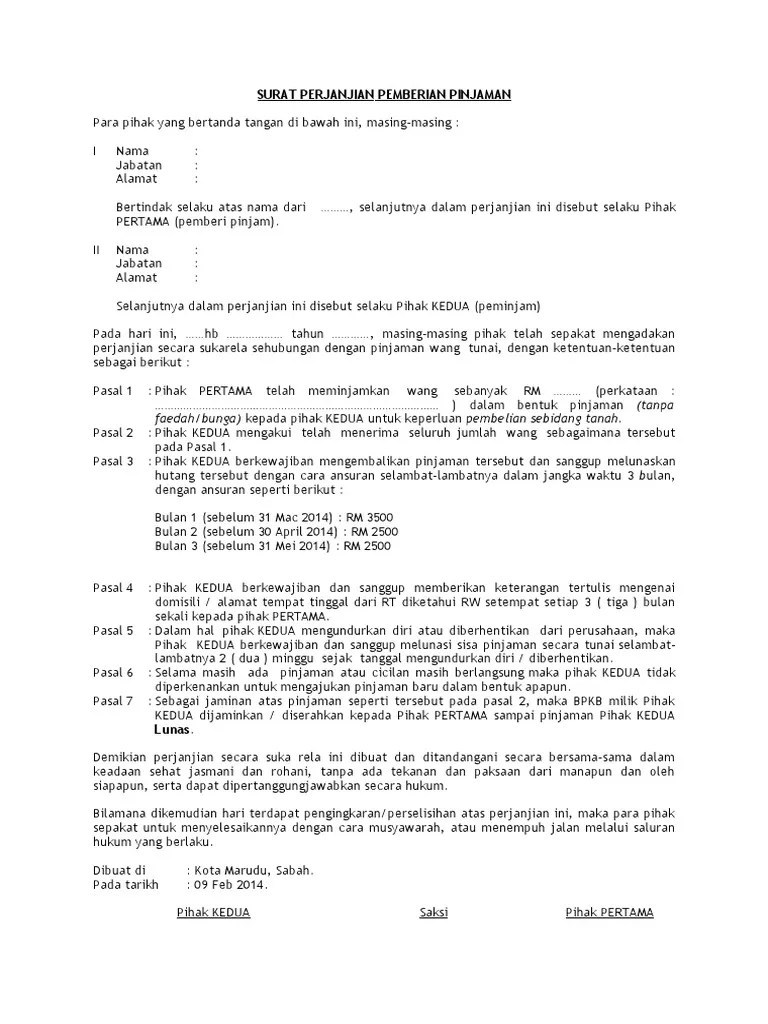 Namun untuk mengesahkan perjanjian kerjsama yang dijalani, maka kedua belah pihak sebaiknya tetap menggunakan surat perjanjian kerjasama. Ketika bank memberikan pinjaman uang kepada nasabah, bank tentu saja mengharapkan uangnya kembali. Kerjasama tersebut bisa dilakukan oleh dua orang atau dua pihak, bahkan juga lebih. Pengeluaran pinjaman pertama dibuat setelah pelajar memulangkan dokumen perjanjian lengkap kepada ptptn. Aug 11, 2021 · surat perjanjian pelunasan hutang ini memiliki peran yang sangat penting bagi kedua belah pihak yang terlibat hutang piutang.